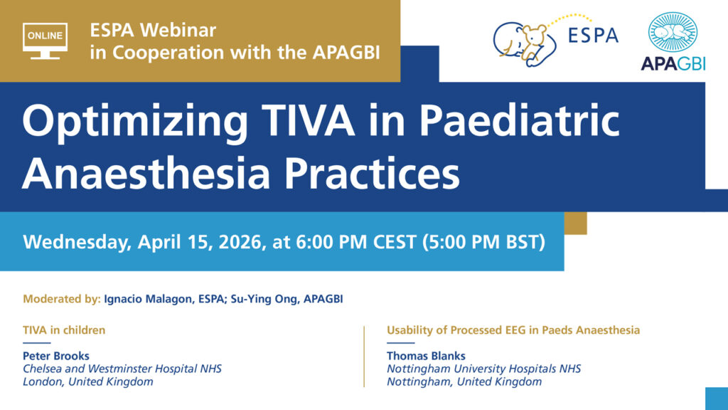 Dne 15. dubna 2026 se uskuteční webinář ESPA–APAGBI, který propojí přední odborníky v oblasti dětské anesteziologie. Program nabídne sdílení zkušeností, diskuzi aktuálních výzev a přehled nejnovějších poznatků z oboru.